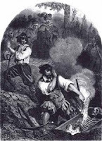 The sister was lying in bed when she heard a terribly familiar scratching at the window. She struggled to get fully awake and scrabbled for a candle and something to light it with. When she got a flame she saw that the shutters were opened. Staring in at her was a brown shriveled face...she saw its long bony hands picking at the lead of the windows. This time she screamed immediately. Her brothers rushed in with their pistols. She pointed to the window, but the creature had gone. The brothers ran out of the front door and saw it moving across the lawn towards the graveyard. They fired and one of them hit it in the leg. It scrambled away into the darkness and they lost it.