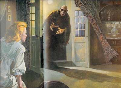 Miss Cranswell soon became aware of two lights in the belt of trees some distance from the house which separated the lawn from the graveyard. She watched and, after a while, she made out a dark shape moving towards the house and towards her window. A terrible horror seized her. She wanted to get up and leave the room, but to go to the door would have meant she had to go closer to the window. Besides she had locked the door from the inside and so would have to stand there and unlock it...all the while clearly visible to whatever was out there. Frozen to the spot, she stared at the shape...but then it turned and instead of moving closer to her window, it started to move around the house. She jumped up and ran towards the door. Her hands were shaking so much that she found it hard to turn the key. And then her heart nearly stopped. Behind her, close to her though she didn't dare look, she heard a scratching at the window. It was outside...just feet away. She stood there petrified with fear still not turning her head. Then she heard the sound of it unpicking the lead which held the glass in place. She forced herself to look and saw that one pane of the mullioned glass had come away and a long bony hand stretched in and turned the window catch. Whatever it was, it came in through the window with a rush and grabbed her...its fingers in her hair, its mouth at her throat. It bit her neck and forced her onto the ground. As it bit her she screamed.