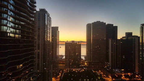 Very soon after he got off the telephone with the hospital, he looked out his hotel room window, which was located on the east side of the building on the 8th floor. He observed a large black object at window level, gliding over North Columbus Drive, between the east side of the hotel and the building across the street. His first thought was that it was a black garbage bag, though soon realized that the altitude of this object was much higher than a garbage bag would typically be seen. Then he imagined that it was an over-sized kite or drone, but it was night time and that was probably not the correct identification.