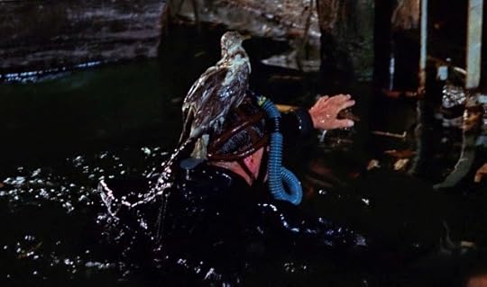 Film: Look at how this opening is translated to screen. We start with a ridiculous looking bird moving across water at night, which then rises to reveal itself as a decoy attached to the top of Bond's SCUBA hood. Because, you know, if you're sneaking into an enemy facility by water at night, being under the surface of said water is just too invisible. You need a bird on your fucking head to really sell it. I digress. Bond is sneaking into a refinery of some sort. He enters a concealed room and lays out some shaped plastic explosive, plants a timer and leaves. We cut to him entering a seedy tavern. He checks his watch, waits one second, and there's a distant fiery explosion. Bond smiles, satisfied even as all the other patrons panic and flee, then he follows the bar's exotic dancer into the back-room for, presumably, a quick after-mission romp.
