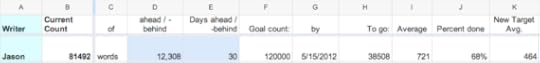 On Google Docs, I keep a spreadsheet that tracks my progress. Every morning, after my writing session, I hop in here and update my word count. The document automatically calculates a number of statistics that tell me where things stand: