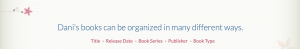 Wait, don’t guess yet. You can sort by publisher, series, release date and more! Do you want all my titles sorted A-X? (I don’t yet have a title that starts with ‘Z’.) Yes! You can sort alphabetically. If you’re in the mood for a bundle or a short, check out the Book Type feature.