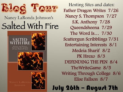 It’s day two of the Blog Tour for Salted With Fire, and today, the lovely Nancy S. Thompson has graciously agreed to be my host. Check her and the remaining hosts out below. Click on the links to be directed to the sites, and be sure to enter the giveaway!
