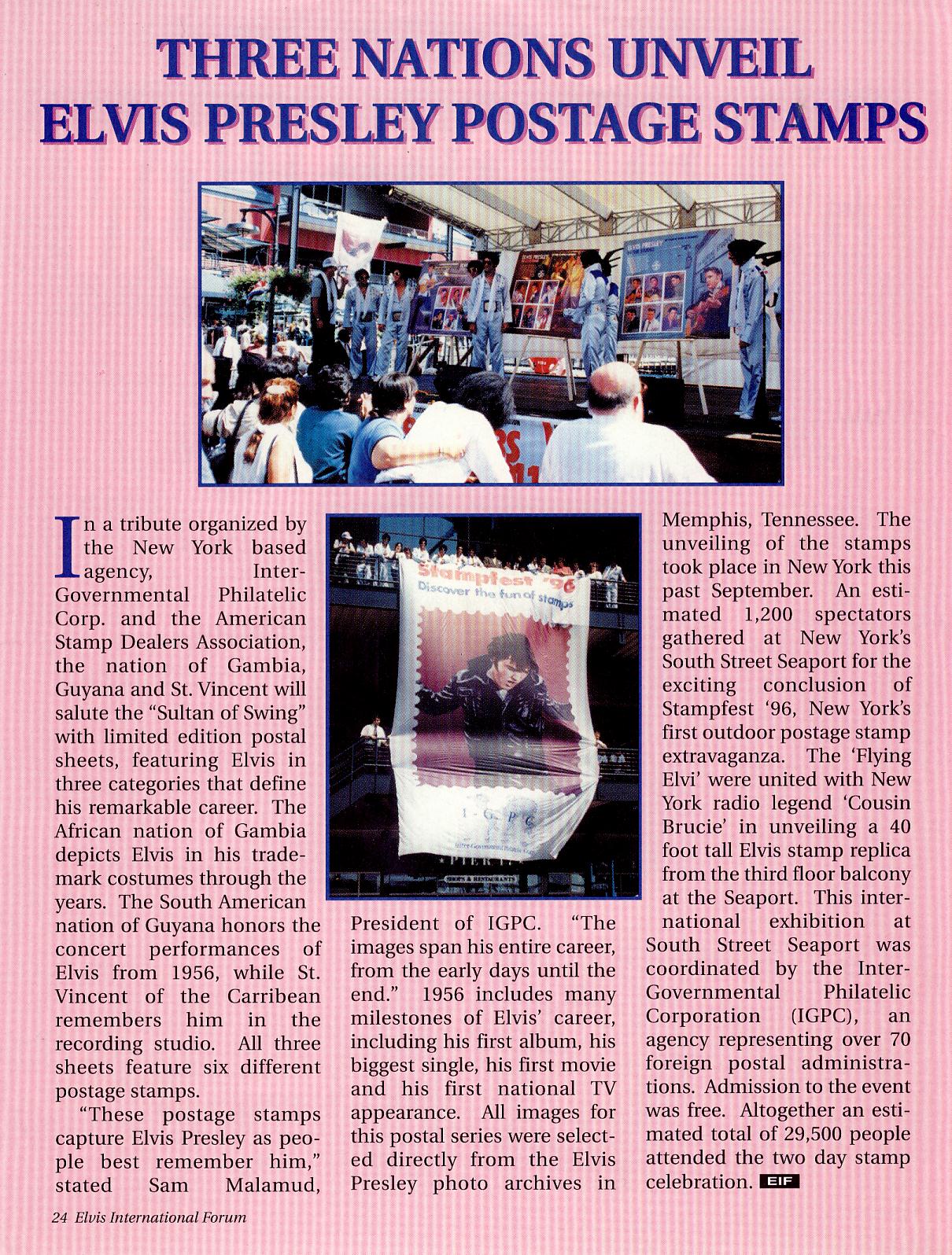 Cousin Brucie and I with The Flying Elvi at Stampfest '96In September of 1996, Bruce served as my on-stage host for StampFest, a postage stamp festival at NY’s South Street Seaport, that drew some 27,000 attendees. Successful as the event was, the ending was shockingly abrupt. Late afternoon hurricane-like conditions suddenly sent the masses scattering… just as the Flying Elvi were skydiving over the East River for our grand finale.I’ll never forget the phone call early the next morning from Cousin Brucie. He roused me from my discouragement and offered to head back down to the Seaport that afternoon to finish up the final performances and ceremony. I raced to get the details organized, then wondered if anyone would bother showing up to witness it.