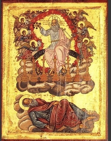 St. John describes his initial vision of Christ in the Apocalypse in terms very similar to the description of Christ at the Transfiguration in the Gospels of Matthew, Mark, and Luke. Christ is shining more brilliant than the sun, in clothes more brilliantly white than possible on earth. The transfiguration itself is commonly associated with the End, the final Judgement and the revelation of the saints and righteous who will also shine more brilliantly than the sun. This “theosis” or “divinization” is also the common term for Greek-speaking Christians to describe salvation itself: by cooperation with God, the human person becomes like God and comes to share certain divine attributes–primarily love-charity. This assimilation of human to divinity is described in 2 Peter 1:4: “… that you may be partakers of the divine nature, having escaped the corruption that is in the world through lust.”