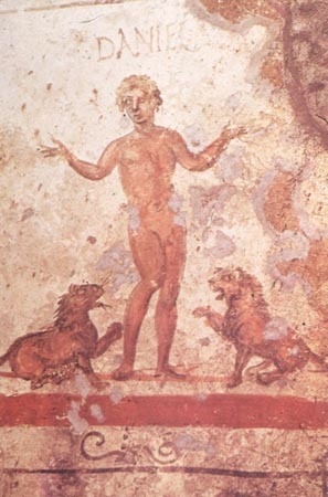 The king of Babylon orders that no one should pray to any god but himself and that no one should practice any foreign religion. (Christians understood this to be similar to the Roman law insisting that they worship the emperor rather than Christ.) Daniel, a Jewish man promoted to an important government position in Babylon, is accused by his Babylonian enemies of prying to the God of Israel and practicing the Jewish religion. The king is forced to obey his own law although he does not want Daniel to be killed. The king orders Daniel to be thrown into the den of hungry lions and a heavy stone is used to shut the den. When the stone is rolled away, Daniel is found unharmed (“a shepherd to the lions as though they were sheep,” as one Christian hymn says) and the lions attack his enemies instead.