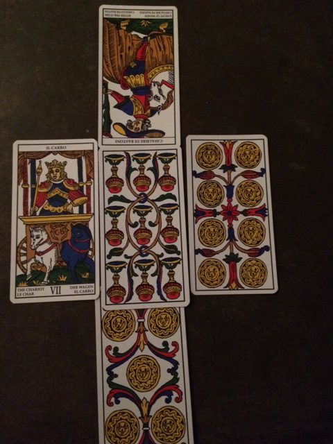 A 5-card spread reveals a slightly more complex reading for 2017. The year begins with the Knight of Wands (reversed), followed in the spring by the 8 of Pentacles/Coins, a summer dominated by the 5 of Pentacles, and concluded by The Chariot in the autumn; the 9 of Cups (reversed) is present throughout the year. The quick-and-easy explication of this spread would warn us against an immature person who is headstrong, bossy or a bully-and a risk-taker, who can do dangerous things and convince others to do dangerous things and who dominates the beginning months of the year. In reaction to this person, everyone else must work harder at self-improvement and personal growth (spring) which forces us to confront our own pride or humility in the summer and take appropriate action based on these realizations. In the autumn, this implies a struggle and an eventual, hard-won victory over enemies, obstacles, nature, the uncertainties inside each of us. But this will require confidence as well as unity of purpose and control (between each of the struggling aspects of our personalities as well as in society as a whole) and, most especially, motivation.