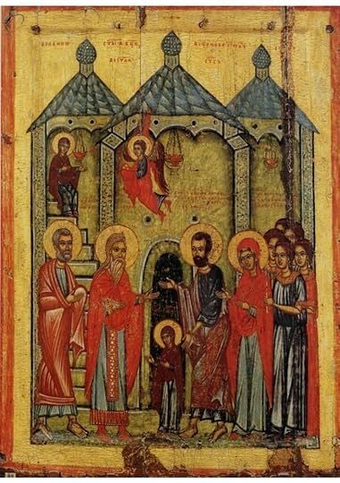 The community of women who live at the Temple is alluded to by St. Luke in his Gospel by the Prophetess Anna (in Luke 2), an elderly woman who meets Christ in the Temple when he is forty days old. But the story in the Protoevangelium still strikes many as unlikely. Throughout the Old Testament we read of women who waited at the door of the Temple or the Tent of Meeting in the wilderness (Exodus 38:8; Numbers 4:23, 8:24; 1 Sam. 2; as well as 2 Maccabees 3).