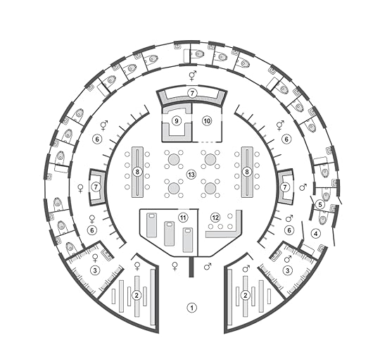 Bird’s-eye view of a grand public restroom: 1 entrance, 2 changing rooms, 3 urinals, 4 large toilet rooms, 5 small toilet rooms, 6 showers, 7 saunas, 8 trough sinks, 9 lactation room, 10 attendants’ office, 11 massage room, 12 espresso bar, 13 recreational tables. Female/male symbols indicate segregated versus coed sections. Concept and design by Isham Cook.As in existing, conventional public restrooms, the divided entrance requires women and men to enter separately. If one just needs to urinate, there are segregated urinal rooms directly facing the first interior entrance on either side. If one needs to defecate, there are two options. First, private-use toilet rooms line the outside circumference of the structure, larger wheelchair-accessible rooms with a baby-changing table, toilet and sink, alternating with smaller rooms containing a toilet and sink. A sign on each door indicates whether the room is occupied or vacant (as in airplane cabin toilets), but with a big “O” or “V” so that the sign can be read from a distance. There is also an electronic display at the main entrance showing the occupancy of all the numbered toilets at a glance, enabling users to quickly locate a vacant toilet. Attendants would be aware of which toilets were in operation and could notify those hogging a toilet for an inordinate length of time. Likewise, if the user has a medical issue or emergency the attendant can be alerted and spoken to via intercom.