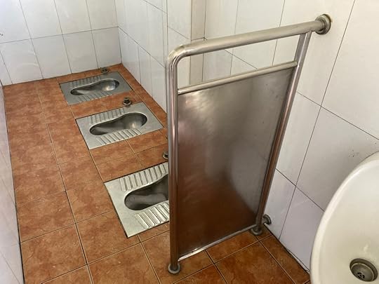 In the nation’s capital, standard public WCs of the time weren’t all that much better: dark, dirty cinderblock cells with two facing rows of squatting holes. Low dividers partially separated you from adjacent users but not from those sitting opposite; some WCs lacked dividers altogether. Clearly, this was a more “social” culture, where people felt less awkward about the communal witnessing of all aspects of daily life including the bodily functions, where the concept of individual privacy was less refined than in the “civilized” West. I had no choice but to get used to being stared at shitting by curious males whiling away the time with their cigarettes, newspapers and chitchat, sometimes quite overtly about me, naturally assuming I had arrived in the country that very day and couldn’t speak the language (after decades here some still call out to me on the street, “Welcome to China!”). If you were out for the evening you could always use the restaurant toilet, if again it actually had one, and you didn’t mind soiling your shoes in the inevitable puddles of urine, spit, cigarette butts and stray feces surrounding the squat receptacle. So extravagant were these examples of national performance art that they have attracted comment. As did David Sedaris on a trip to China in 2011 and as Arthur Meursault wickedly satirized in his novel, Party Members (Camphor Press, 2016), I found these public potty displays, for want of a better word, funny.