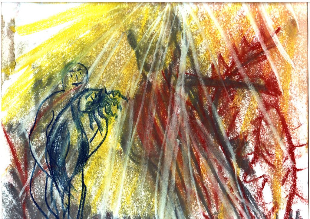 Ostalo je tek nekoliko ugaraka kada se probudio. Preko puta ugleda nepomičnu priliku. Čvornati štap koji je vukao sa sobom u nedostatku boljeg oružja ležao je pored njega, ali nije posezao za njim. Da je hteo, stranac bi ga odavno ubio.