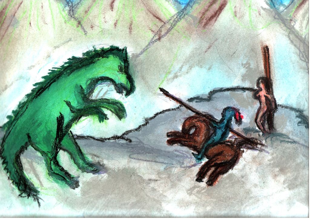 Popi nekoliko jaja na brzinu, uze štap i zavežljaj i taman kada je hteo da krene, pogled mu privukoše čudne linije upola prekrivene mahovinom, baš iznad mesta gde je spavao sinoć. Nije ih primetio zbog mraka. Zašto bi neko pisao po steni i crtao znakove osim ako nije...
