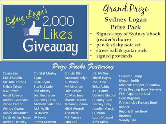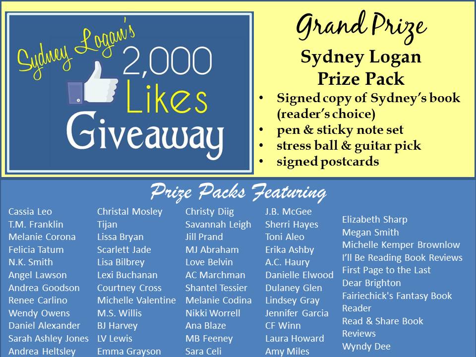 Sydney Logan's 2,000 Facebook Likes Giveaway goes live September 18 at Midnight EST! Thanks to the readers, bloggers, and authors for helping us reach that milestone and for donating to the giveaway!