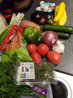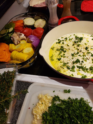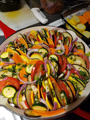 Let's be honest. Ratatouille is a GREAT way to clean out the vegetables in your fridge begging not to be tossed. As long as you have garlic, you can cobble together a batch. It's as simple as gathering your ingredients, slicing them up (in pretty, concentric pieces if you want to create a statement dish to WOW your guests; meanwhile, cubed and done up as a stew tastes just as fabulous). For this most recent batch I made (as pictured), I used yellow and zucchini squash, eggplant, button mushrooms, sweet potato, carrot, bell pepper, tomato, and red onion. Flavoring came from garlic, green onion, fresh thyme, and parsley, which I sauteed down before layering in the sliced vegetables. Cover for first 20 minutes of baking to encourage steaming, then uncovered until the veggies are all done. Can be eaten alone, or as a hearty side. If you have some red wine on hand to add to the steaming liquid, even better!