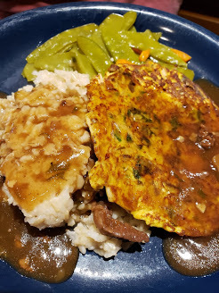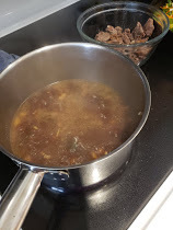 *Step Three is to make your gravy and set it on low while you do the rest of the work. About 1 teaspoon each Tamari soy sauce, sriracha, white pepper, one bruised lemon grass, a sliced green onion, and a clove or two of chopped garlic. Mix with 2 to 2&1/2 cups beef stock (I use bouillon to make mine; if doing a different protein, then we would have used our homemade chicken and veg stock), and bring to a simmer. Add a corn starch slurry (1-2 teaspoons cornstarch mixed with water or broth) to thicken the sauce right before serving. Note: we also mixed some of the cooked rib-eye, along with the drippings, into the gravy for extra flavor. You could also do this with other proteins. Some people like peas and carrots added to their gravy, too. Your choice.
