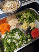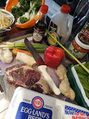Hi! It's me again, back with another long-time family favorite which, for some reason, we'd never actually attempted to make at home. We've only ever ordered it. After this roaring success (we all loved every bite), we won't be making that mistake again. This will probably be visiting our dining table on a much more frequent basis now. For this round, we used a boneless rib-eye that was in the freezer stash, and our choice of veggies included: 2 cups chopped baby bok choy, 1 1/2 cups bean sprouts, 1/2 c diced king mushrooms, 1 shredded carrot, 1 bunch of green onions, and a 1/4 of a red pepper. On the side we served sauteed snow peas with garlic and king mushrooms, and white rice (done in the rice cooker).
