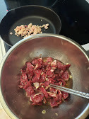 Get your meat, eggs, the gravy, or sauce, ingredients*, and vegetables together. Prewash/scrub the veg and aromatics (garlic, ginger, and green onion), then dice and chop everything into smallish pieces. If you like chunky raw veg, then feel free to leave the pieces larger. Rinse and drain the bean sprouts, and set to the side. Since the rib-eye had a nice bit of marbling in it, I cleaned the fat out, trimmed it down into tiny pieces and got them rendering in the skillet while the meat was diced and put into a quick marinade of peanut and sesame oil, garlic, salt and pepper.
