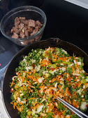 Step Two: Sautee the rib-eye until it is still slightly pink in the middle and remove from pan. Once cooled, run your knife through it again to get the meat down to smaller "pancake friendly" bite sizes. Pour most of the drippings off to add to your gravy, and then while the pan is still hot, go ahead and get a pre-cook going on your veg. Cabbage and carrot can take longer than egg to cook, so if you don't want raw veg in your finished dish, this step alleviates that. Leave the bean sprouts raw. Set the cooked veg aside to cool while you move on to the gravy and beating the eggs (we did 2 per person, and ended up with 7 pancakes at the end).