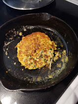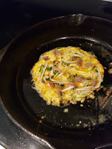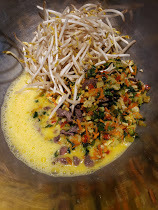 Step Four: Assembly. Crack and beat your eggs. Fold in the cooked meat and veg, and then add the bean sprouts. Stir to mix. Scoop a half cup or so of mixture into hot skillet seasoned with sesame and peanut oil. Use a spatula to keep the egg contained and "shape" the pancake. Once done, move to a warmed oven with set up with a cookie sheet to receive the pancakes as they are cooked.