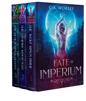 Book 1: THE WOLF KING’S BRIDE (Nora and Kellan)Book 2: THE VAMPIRE KING’S MATE (Eden and Viktor)Book 3: THE DEMON KING’S DESTINY (Evelyn and Marrok)