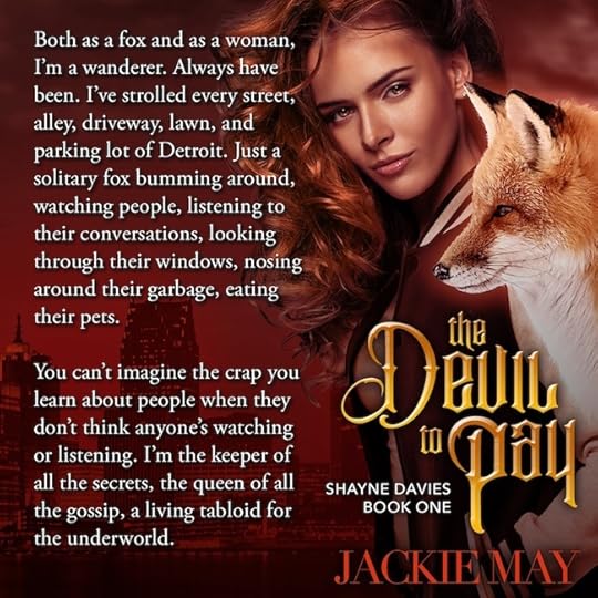 When it comes to talented new recruits at the Federal Underworld Agency, Nora Jacobs is only half the story…The Devil to Pay is the first book in Jackie May’s companion series to Nora Jacobs, set in the same urban fantasy Detroit, sharing several supporting characters (hello, Nick Gorgeous), but with a new main character, Shayne Davies. This series can be enjoyed on its own, but readers of the Nora Jacobs books will be more familiar with the world and its characters.As a fox shifter, Shayne Davies gets no respect in an underworld run by the fearsome and powerful—werewolves and vampires, sorcerers, demons, and mythical faerie creatures. Even at home, Shayne is still treated like the brat of the pack. Her mom constantly nags; her intended (but unwanted) mate ensures plenty of awkward silences, and Shayne is even expected to act submissive to the pack’s future alpha…a six year old.Yeah. Time for Plan B.All Shayne wants is to prove that she’s got what it takes to run with the big dogs, which is why she is constantly hounding Nick Gorgeous to make her an agent at the “Double D”, the Detroit Division of the FUA. That’s an easy “No” for Gorgeous, who keeps a strict “No Shayne Davies” policy. Well, never say never. When mysterious underworld criminals steal a load of bomb materials, the FUA picks up a messy case nobody wants to touch. It’s bad enough that a demon horde is involved, but now the annoying FBI has sent out an agent to babysit the investigation. To make matters worse, the notoriously uncooperative master vampire Henry Stadther has control over what may be the only key to breaking the case: a handsome human detective.The whole thing’s a hopeless disaster.So, guess what, Shayne? You’re hired!Goodreads / Amazon
