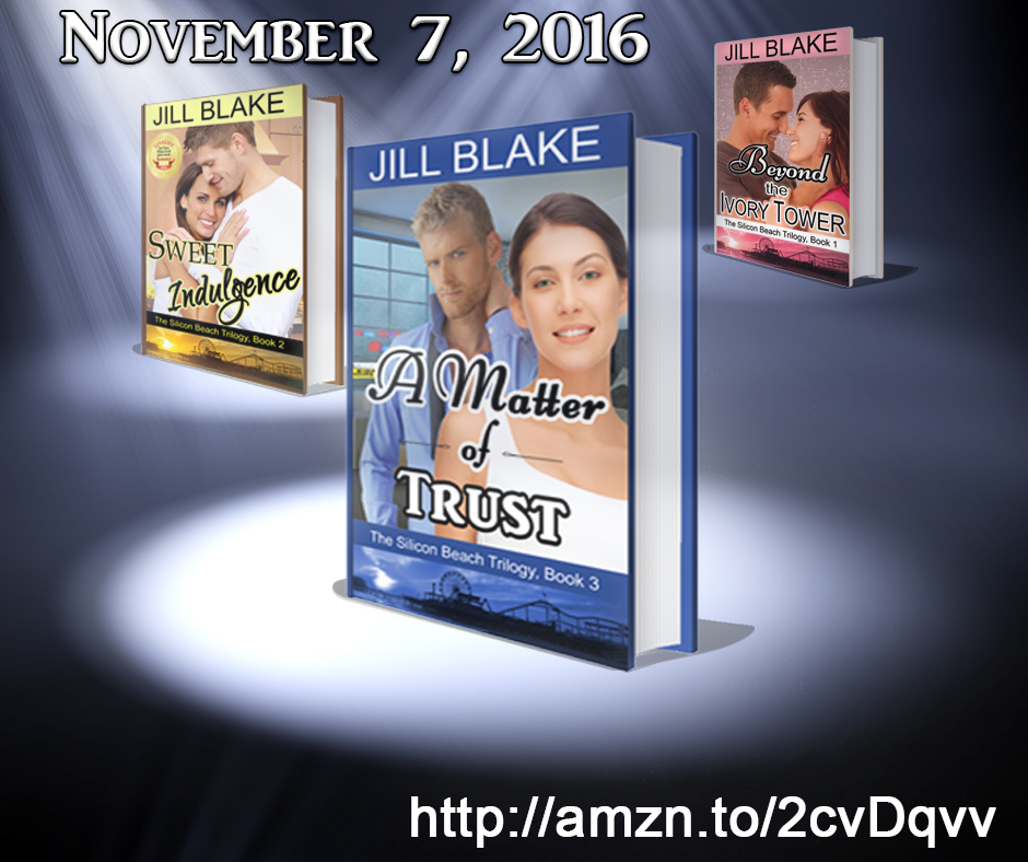 A MATTER OF TRUSTThe Silicon Beach Trilogy, Book 3by Jill BlakeGenre: Contemporary Romantic SuspenseContent warning: For mature audience only. Rated 18+ for occasional profanity and explicit sex scenes. Also includes off-stage murder (though no graphic description of violence).