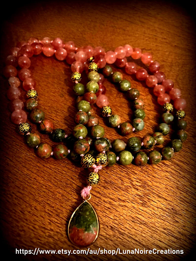 One of my latest handknotted malas is this beautiful piece made from unakite and gold sunstone AA+ graded 8mm crystals that is highlighted with gold toned spacers and finished off with an unakite pendant.