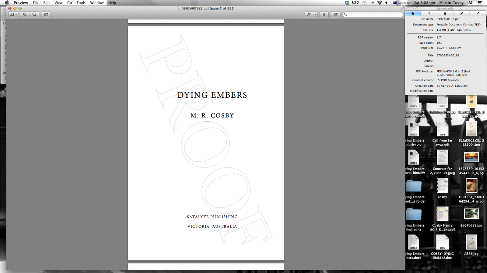 Well, it's nearly here. Yesterday I looked over the final proofs for my first short story collection, Dying Embers. The publishers, Satalyte Publishing, have approved them and they've gone off to the printers. The ePub version is up at Smashwords, available for pre-order, and the other formats will be from Amazon on Monday April 28.