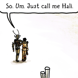 Can you believe I actually deliberated over whether or not to have the bug leg sticking out of Hali’s mouth in that last panel? Good thing I came to my senses.