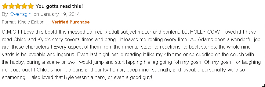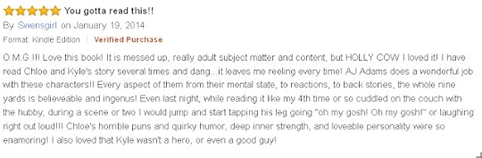 The Bonus: “O.M.G.!!! Love this book! It is messed up, really adult subject matter and content, but HOLLY COW I loved it! I have read Chloe and Kyle's story several times and dang...it leaves me reeling every time! AJ Adams does a wonderful job with these characters!!” Swensgirlon