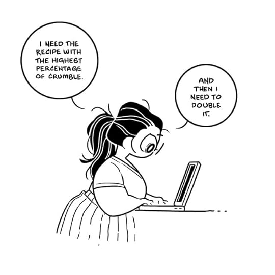 Panel 3: The camera shifts again. Darkened in the extreme foreground is all the kitchen utensils and dishes she used to make dinner. They are stacked messily and forgotten. Who knows when they’ll be cleaned. Past the kitchenette, we see several little Essex’s bustling around her little dining table to take more pictures from several different angles. 'Click clicks’ abound.