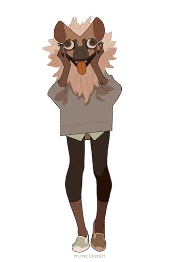 Description: A slight figure in leggings and an oversized sweater, holding up a hyena mask over their face.