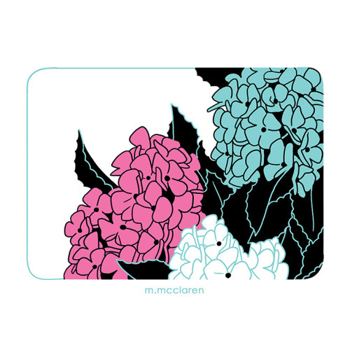 Description: An illustration of pink, blue, and white hydrangeas with black leaves.
