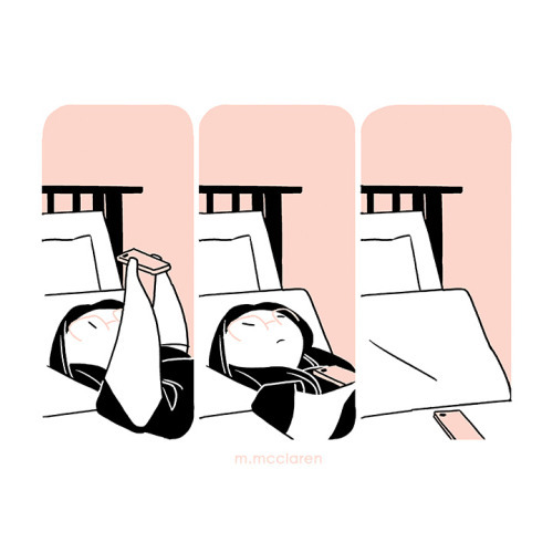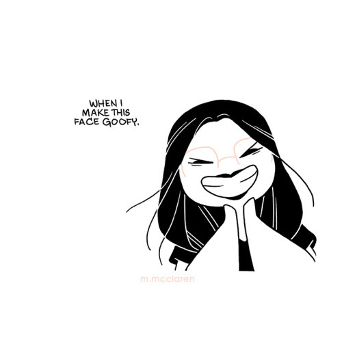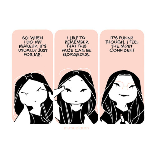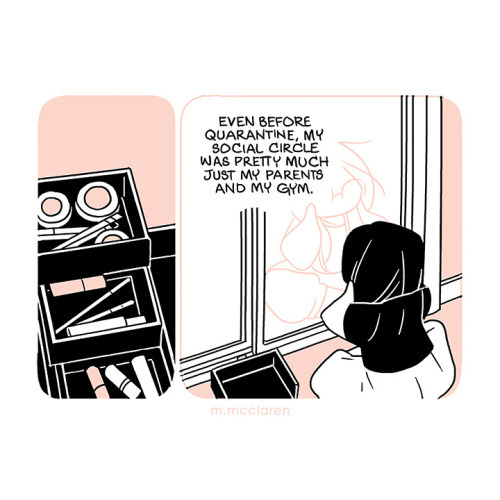 Description: A comic in black and white and soft pink. The first three panels show me lying in bed, looking at my phone. I put my phone down, then leave the bed and abandon it. The next panel shows my makeup box. I sit in front of my bedroom mirror. Text reads: ‘Even before quarantine, my social circle was pretty much just my parents and my gym.’ In the next three panels I am doing my makeup. Text reads: ‘So when I do my makeup, It’s usually just for me. I like to remember that this face can be gorgeous. It’s funny though-’ In the last panel I am making an exaggerated happy face. Text finishes: ‘-when I make this face goofy.’