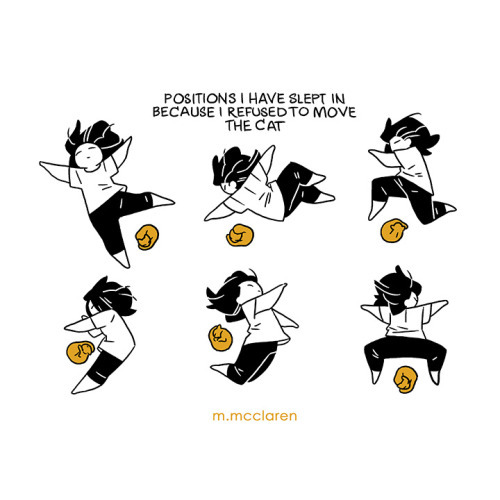 [Description: A caption reading ‘Positions I have slept in because I refused to move the cat. Followed by six illustrations detailing interesting sleeping positions designed around the cat’s location.]