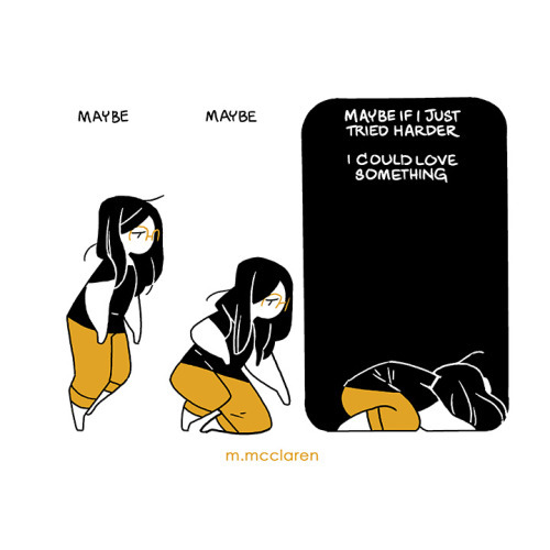 [Description: A three panel comic. In the first two panels I am slowly lowering myself to the ground. In the third panel I am curled in on myself. The caption reads: Maybe. Maybe. Maybe if I just tried harder, I could love something.’]