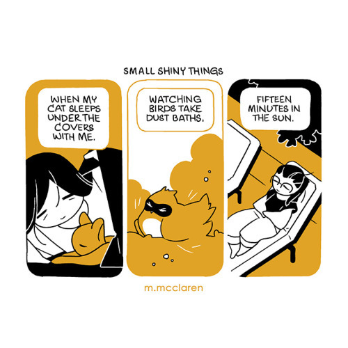 [Description: A three panel comic. The caption above reads: ‘Small Shiny Things.’ The first panel reads: ‘When my cat sleeps under the covers with me.’ and shows me holding the sheets up for my cat to snuggle in. The second panel reads: ‘Watching birds take dust baths’ and shows a bird doing just that. The third shows me relaxing in the sun. Text reads: ‘Fifteen minutes in the sun.’]
