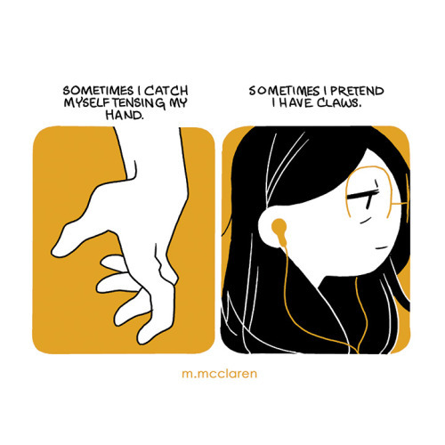 [Description: A two panel comic. In the first panel, my hand is tensed as I explain that sometimes that’s a thing I do. The second panel is a picture of me, looking a little worn down. The caption explains ‘sometimes I pretend I have claws.’]