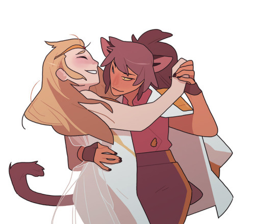 [Description: An illustration of Catra and Adora in their season 5 formal attire. They are dancing as Adora laughs.]