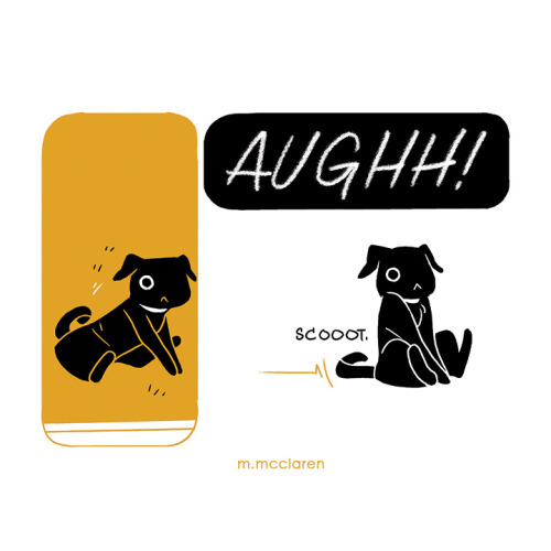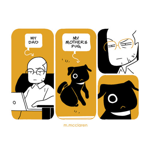 [Description: In the first panel we see my dad, looking unamused. The second panel has my mother’s pug, Lucy, on the carpet. In the next two panels both are eyeing each other. In panel 5, Lucy moves her upper body a little forward… so she can scoot her butt on the carpet in the next panel. My father yells.]