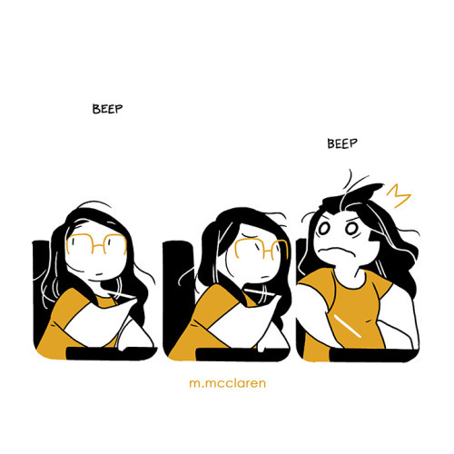 [Description: A three panel comic where I sit at my desk drawing. In the first panel, I have looked up as I hear a disembodied ‘beep.’ In the second panel I have tentatively returned back to work. In the third panel, I have jumped and look around wildly as I hear the ‘beep’ again, signalling that the sound is going to repeat itself until I find it.]
