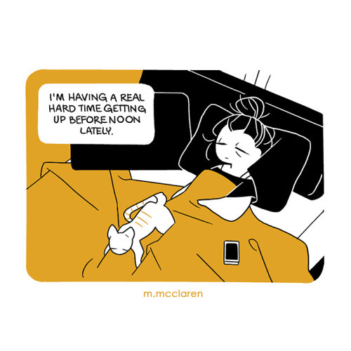 [Description: An illustration of myself reclining in bed. My cat lies on my legs, my phone rests to my side. Text reads: ‘I’m having a real hard time getting up before noon lately.’ Which is accurate and troubling.]