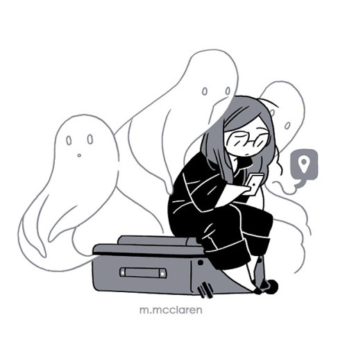 [Description: A cartoon of myself sitting on some luggage, looking at my phone. Around me are three ghosts.]