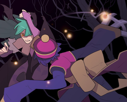 [Description: Morrigan and Hsien-ko from Darkstalkers in the middle of a fight at night in a forest.]