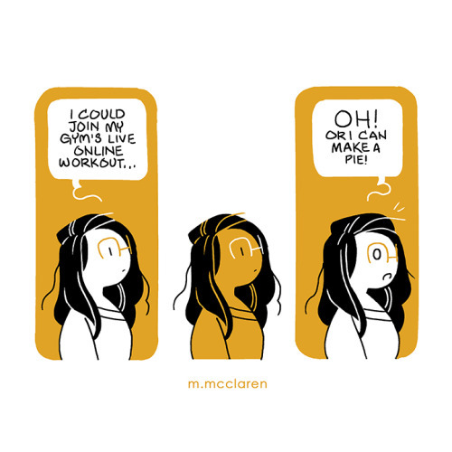 [Description: A three panel comic wherein I mull over working out live with my gym online… or making a pie. Pie won.]