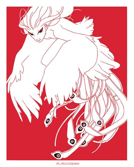 [Description: An illustration of a Phoenix/Harpy in white and red with spot blacks. She is jumping in the air.]