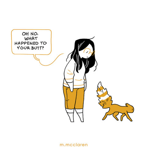[Description: I stand, looking down at my cat as she runs by, questioning what happened to make her tail poof as big as it did.]