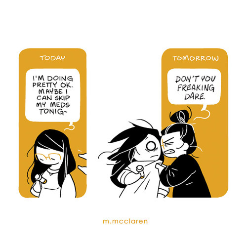 [Description: A two panel comic of myself musing whether or not I need my medications. The me from tomorrow is very insistent that I take them.]