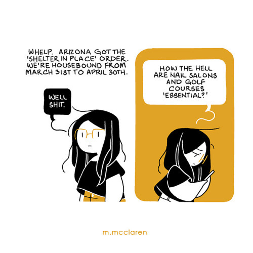 [Description: A two panel comic showing my reaction to being told that we have a ‘shelter in place’ order for Arizona.]