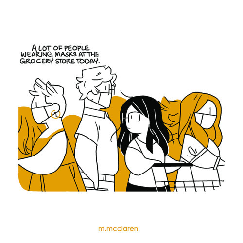 [Description: A one panel comic showing myself standing in a crowd of people all wearing masks. It’s a little surreal to see people actively responding to the pandemic.]